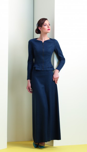 Элегантый жакет с баской эффектно выделяющей линию талии и зрительно уменьшающей ее. Спереди на застежке-молнии, что позволяет регулировать глубину выреза.